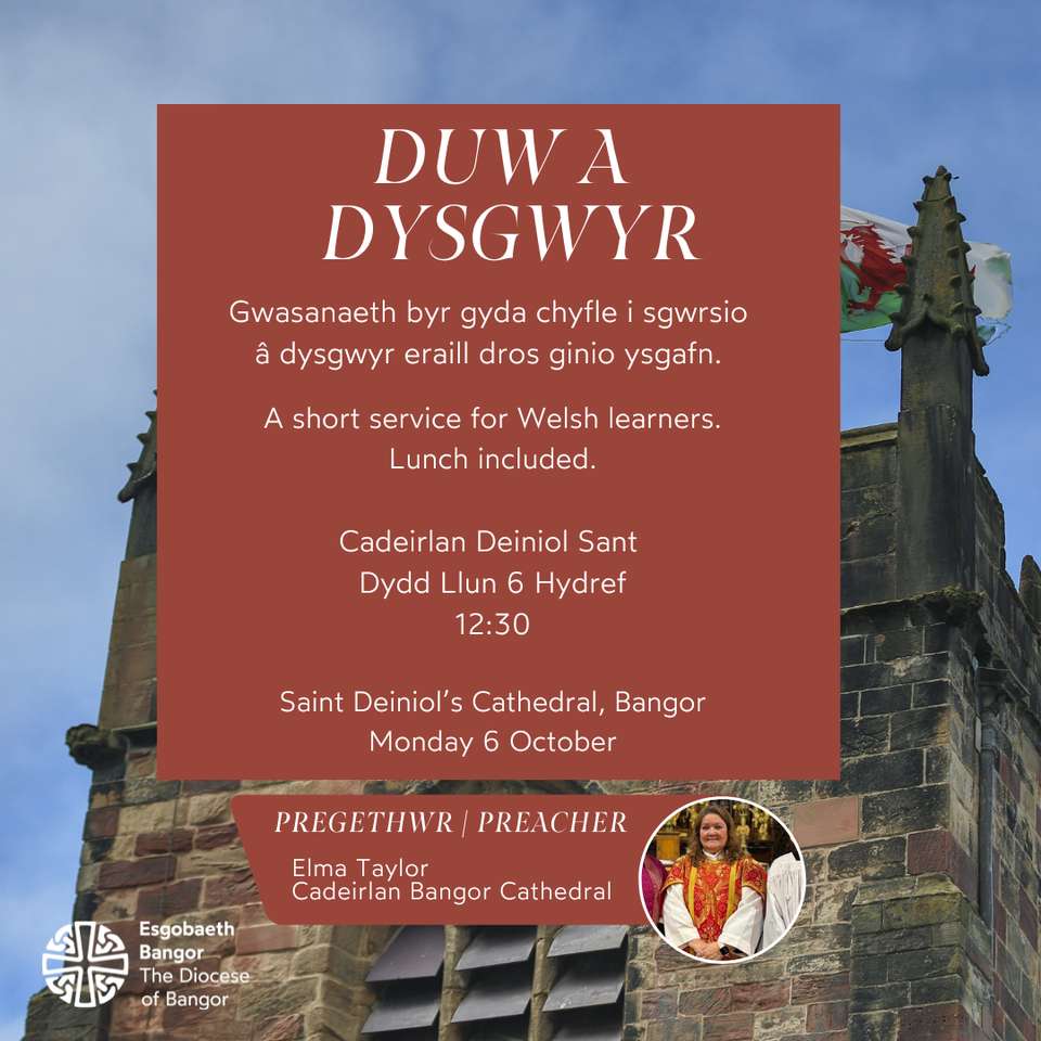 The next Duw a Dysgwyr service takes place on Monday 6 October at 12.30pm at Bangor Cathedral. All Welsh learners are welcome, and no booking is required.