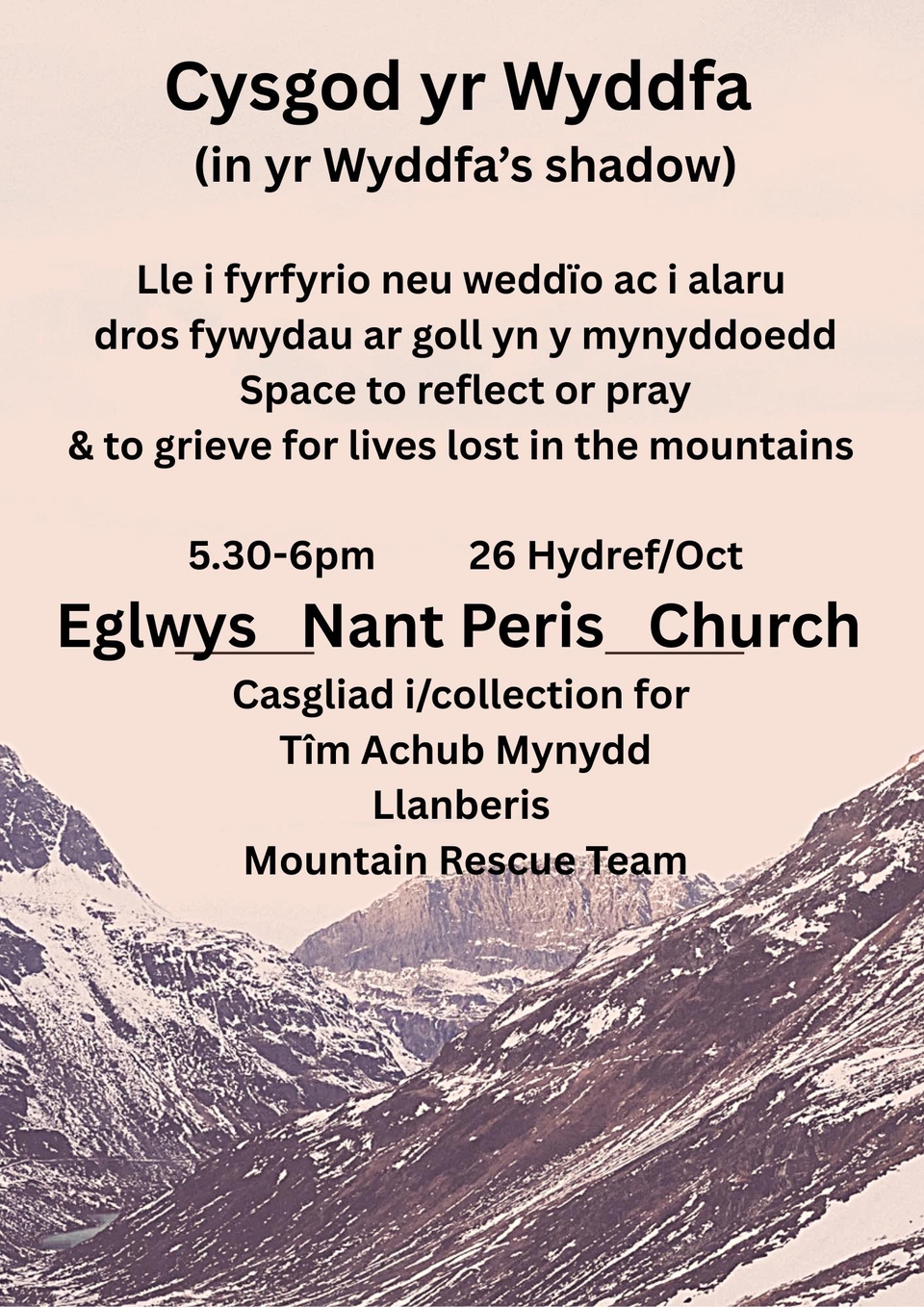 The gathering, titled Cysgod yr Wyddfa (“In Yr Wyddfa’s Shadow”), will be held at Nant Peris Church on Sunday 26 October from 5.30pm to 6.00pm. It has been organised by the Revd Naomi Starkey, Ministry Area Leader for Bro Eryri, following a series of recent mountain fatalities.
