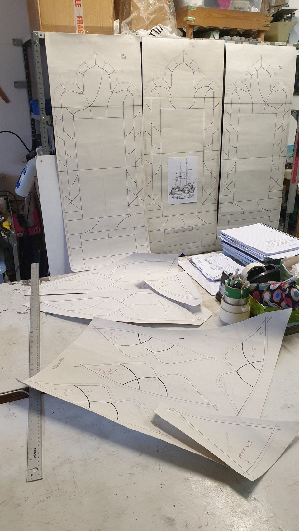 The window has been designed and created by glass artist Jayne Ford. It features three panels, with a central image of HMS Conway as a wooden sailing ship of the line. The side panels show seagulls around the ship’s masts, reflecting a long-standing tradition that the birds represent the spirits of former cadets.