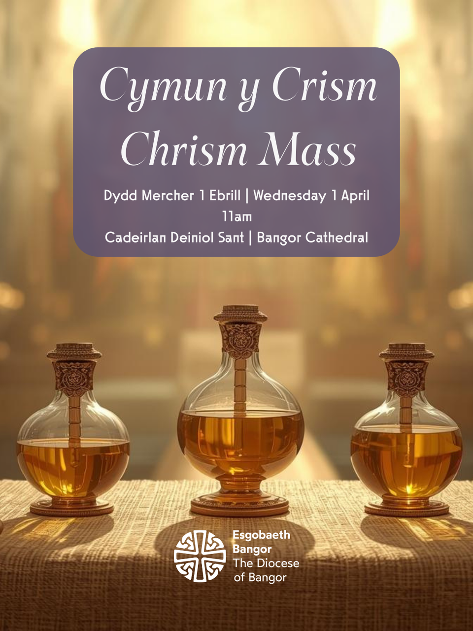 Cynhelir Offeren Y Crism ar ddydd Mercher yn ystod yr Wythnos Sanctaidd, 1af o Ebrill am 11am yng Nghadeirlan Bangor. Rydym yn annog pob offeiriad, diacon a gweinidogion lleyg trwyddedig i fynychu ac mae croeso cynnes i holl aelodau ein cynulleidfaoedd hefyd. Bydd cyfle i adnewyddu ein haddewidion a'n disgyblyddiaeth wrth i ni gerdded gyda Iesu yn ystod yr wythnos sanctaidd hon.
